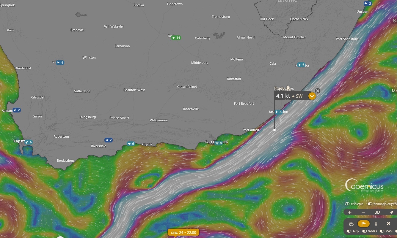 Ta „rwąca rzeka” na Oceanie Indyjskim, to jeden z najsilniejszych prądów na świecie – Agulhas, zwany też prądem Południowoafrykańskim. Jak widać na załączonym obrazku – potrafi on przemieszczać wodę z prędkością nawet 4 węzłów, co daje niemal 100 mil na dobę!!! Co prawda średnio prąd ten przemieszcza wodę o 50 mil na dobę, ale to wciąż ogromna prędkość.