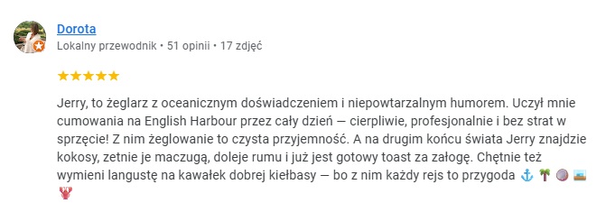 …Uczył mnie cumowania na English Harbour przez cały dzień — cierpliwie, profesjonalnie i bez strat w sprzęcie! Z nim żeglowanie to czysta przyjemność…