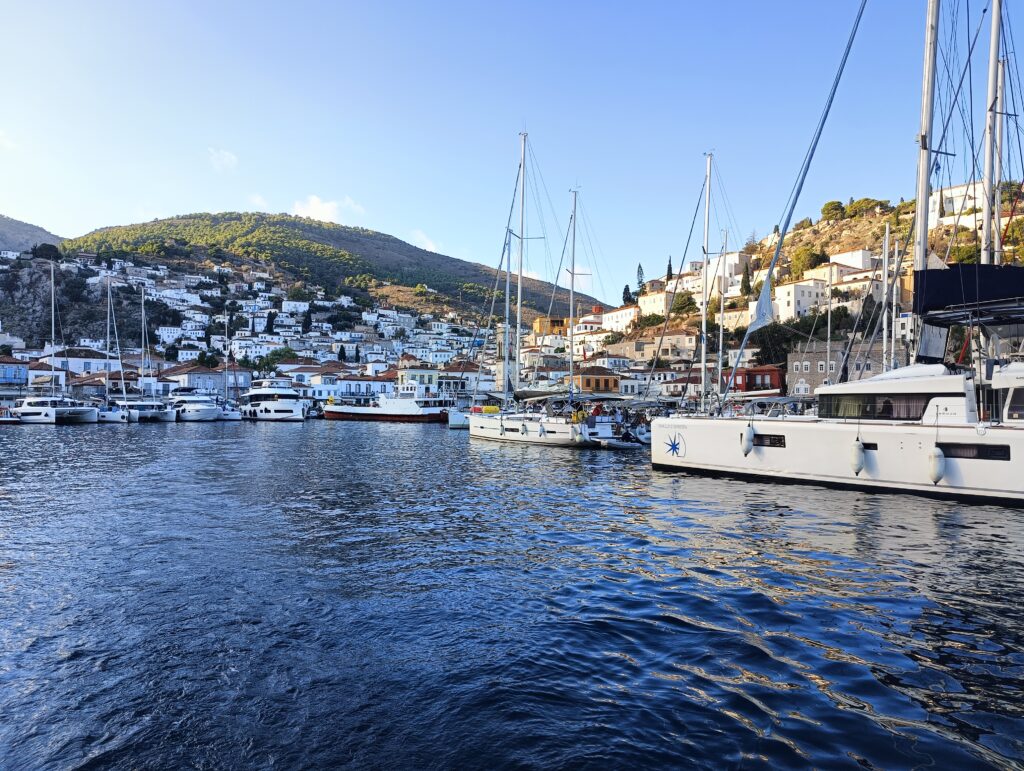 Cumowanie „na Hydrę” – na Hydrze (Ydra), po prawej stronie widać że tylko pierwszy rząd jachtów stoi rufami do nabrzeża. Drugi stoi rufami do dziobów rzędu pierwszego. Czasem bywają tu trzy rzędy…