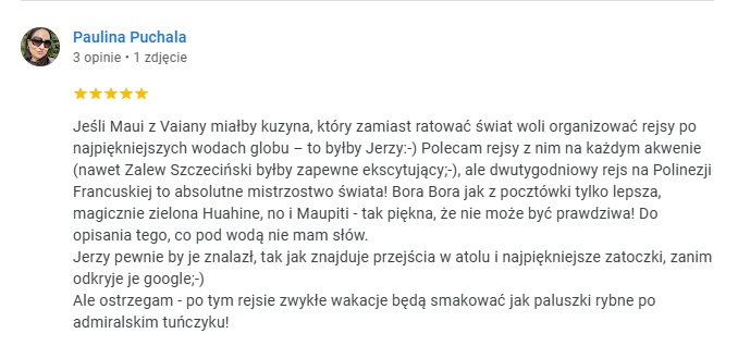 …dwutygodniowy rejs na Polinezji Francuskiej to absolutne mistrzostwo świata! Bora Bora jak z pocztówki tylko lepsza, magicznie zielona Huahine, no i Maupiti – tak piękna, że nie może być prawdziwa! Do opisania tego, co pod wodą nie mam słów. Jerzy pewnie by je znalazł, tak jak znajduje przejścia w atolu i najpiękniejsze zatoczki, zanim odkryje je google…